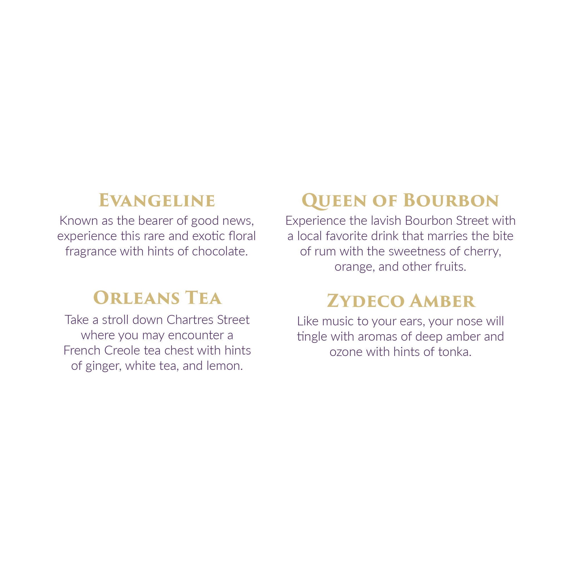 Available in 4 fragrances: Evangeline, Orleans Tea, Queen of Bourbon, Zydeco Amber
