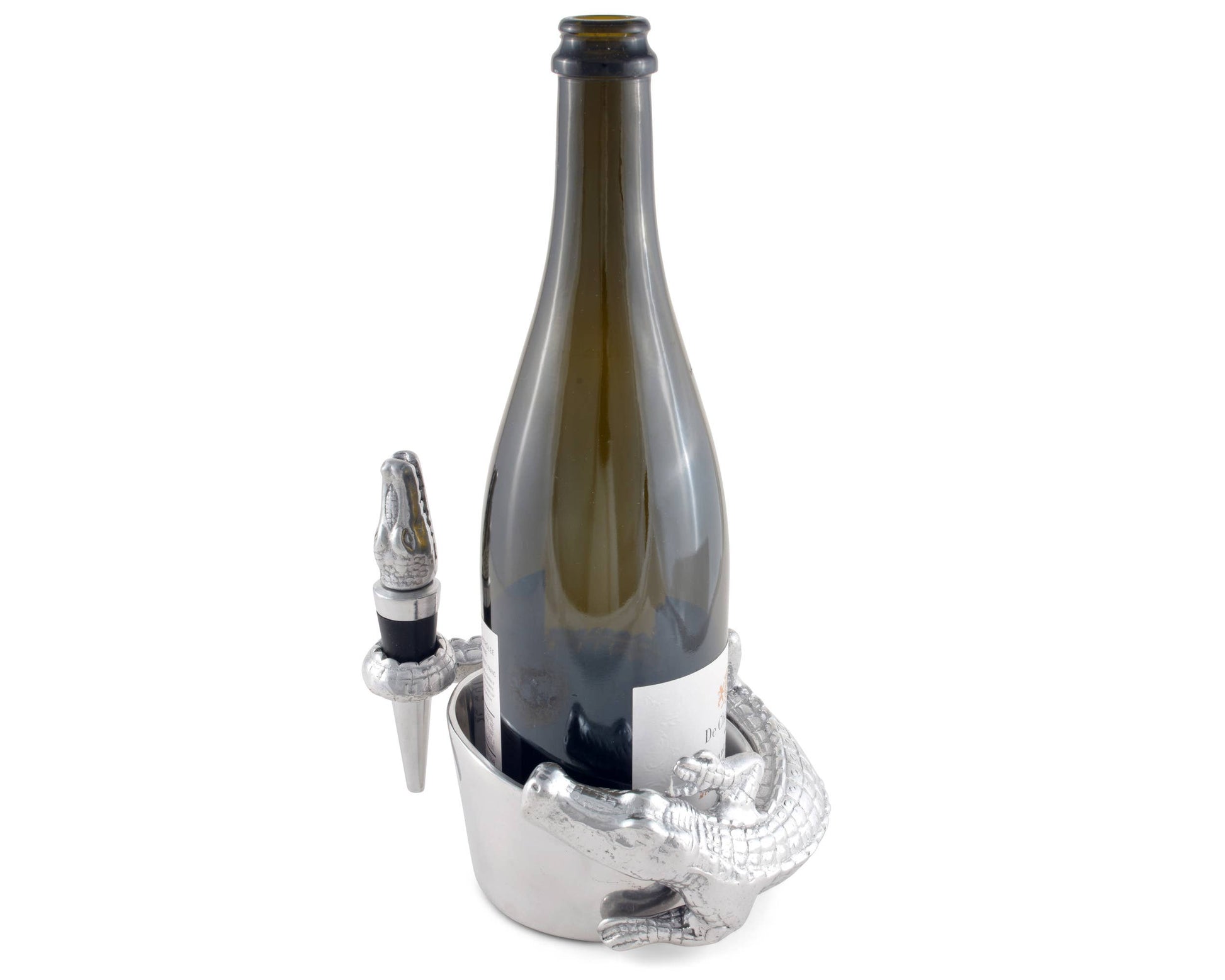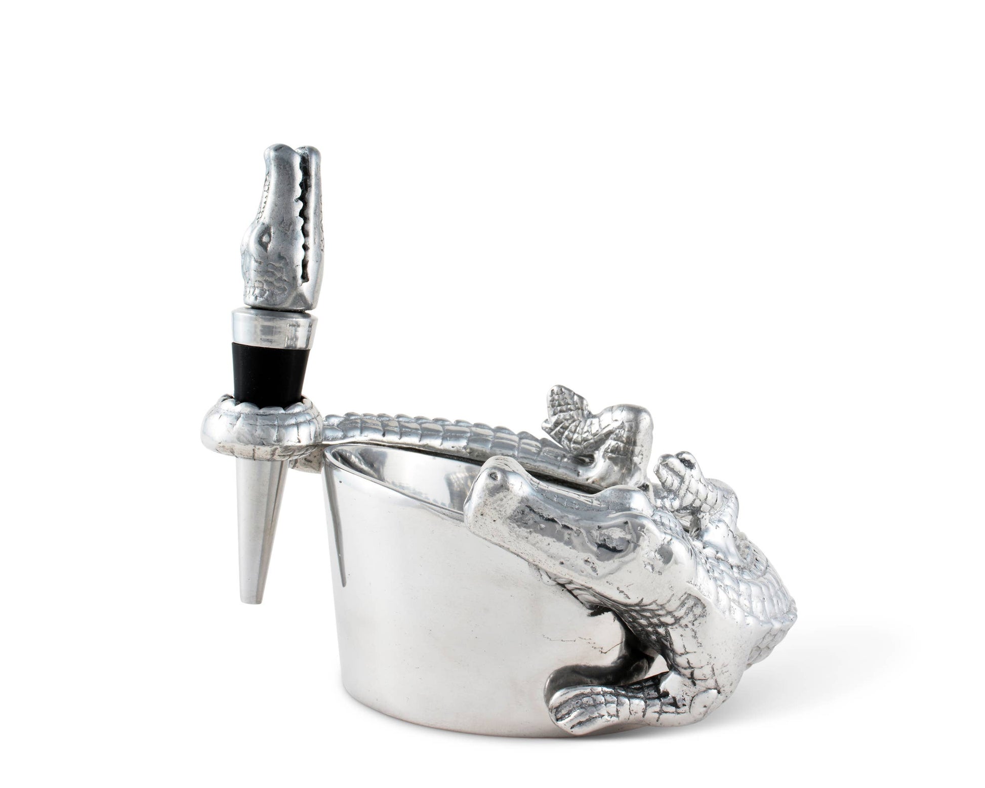 This Arthur Court alligator wine coaster and stopper set features a friendly gator nestled up to your favorite fruit of the vine. The shiny reptile that wraps its scaly body and tail protectively around the edge of the wine coaster just asks for admiration. Meanwhile, a wine stopper crowned with a finely crafted alligator head keeps wine fresh when you put the evening on pause. This 4 x 3-inch ornate barware lies flat against your bar or kitchen counter for easy display or tucks away to lie in wait in your cupboard. If you decide to take this sharp-toothed reptile on the prowl, it's compact and lightweight so that it won't swamp you down on the trek.