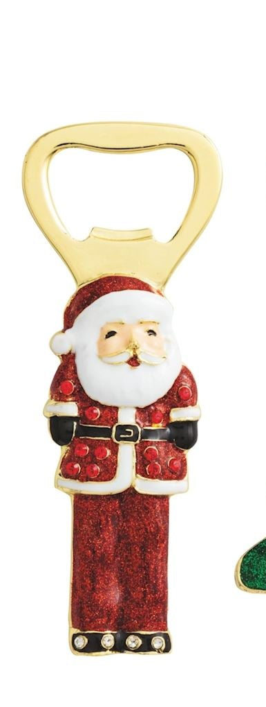 Metal bottle opener features glitter acrylic figural handle with rhinestone detail.
