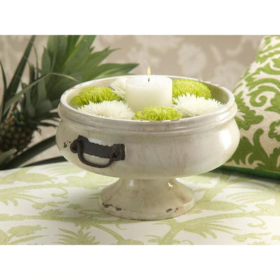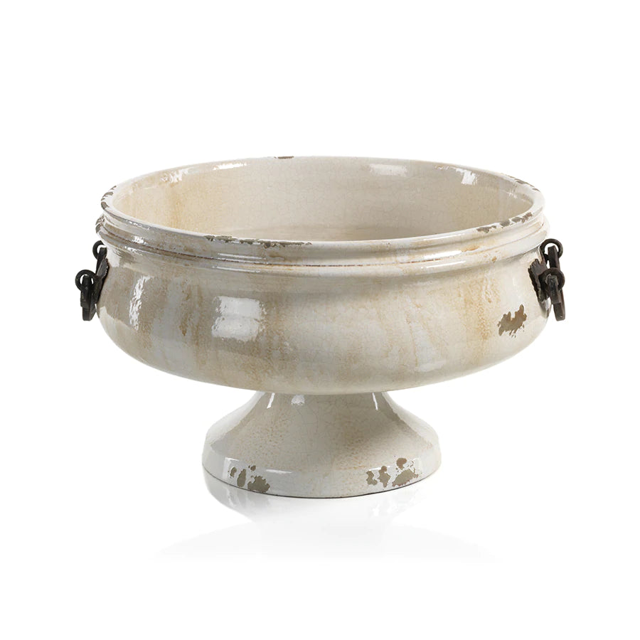 Add an elegant accent piece to your home using the Corsica Pedestal Bowl With Iron Handles. Made from distressed beige and white ceramic. Display it on an entryway table as a decorative piece or use it to hold a cluster of candles.