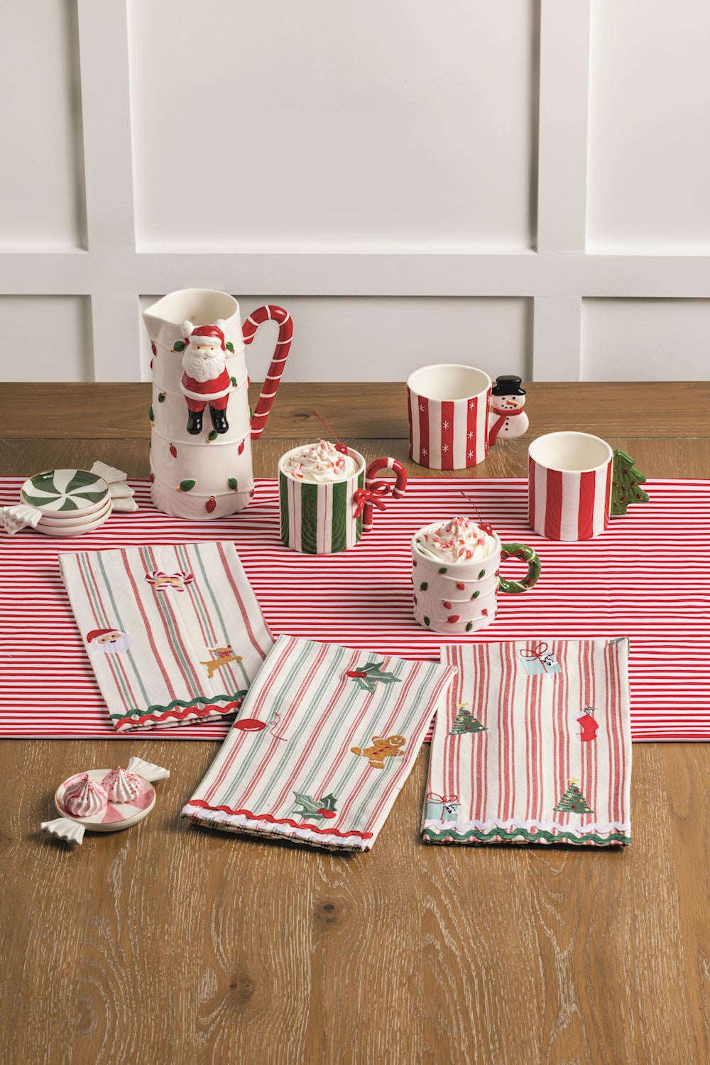 Hand-painted stoneware pitcher features hanging Santa attachment and candy cane handle.