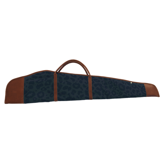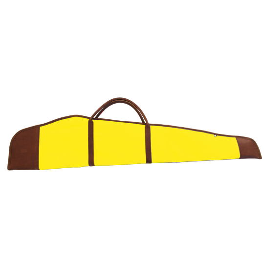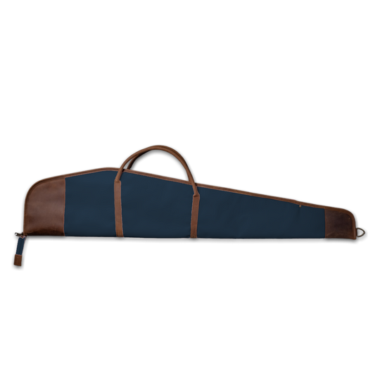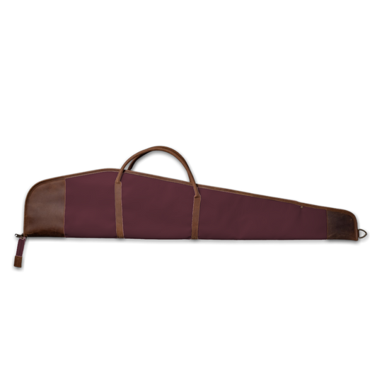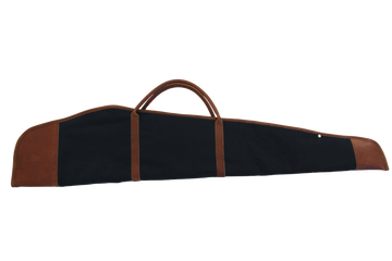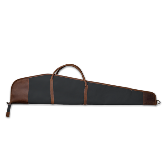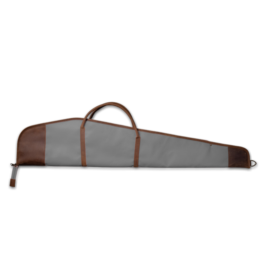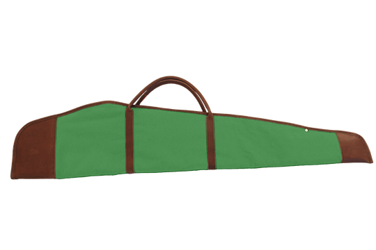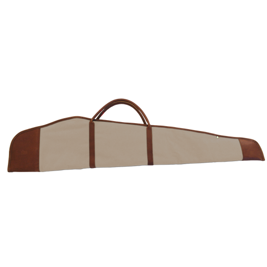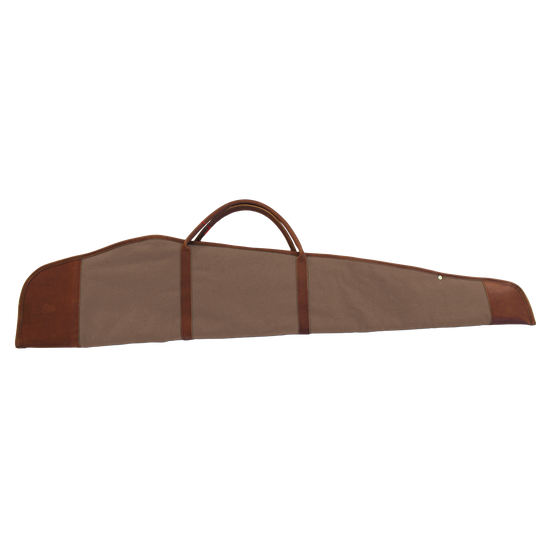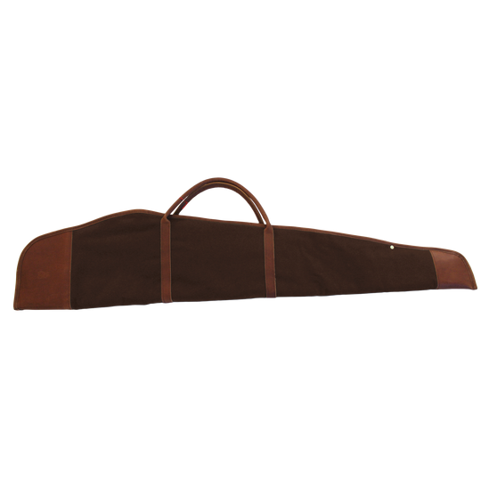 Coated canvas with Oiled Leather trim. Fully lined in fleece for protection. Oiled Leather handles that extend to the base. Zippered closure with antique brass hardware antique brass D-Ring to hang for easy storage easily holds a rifle with a scope.