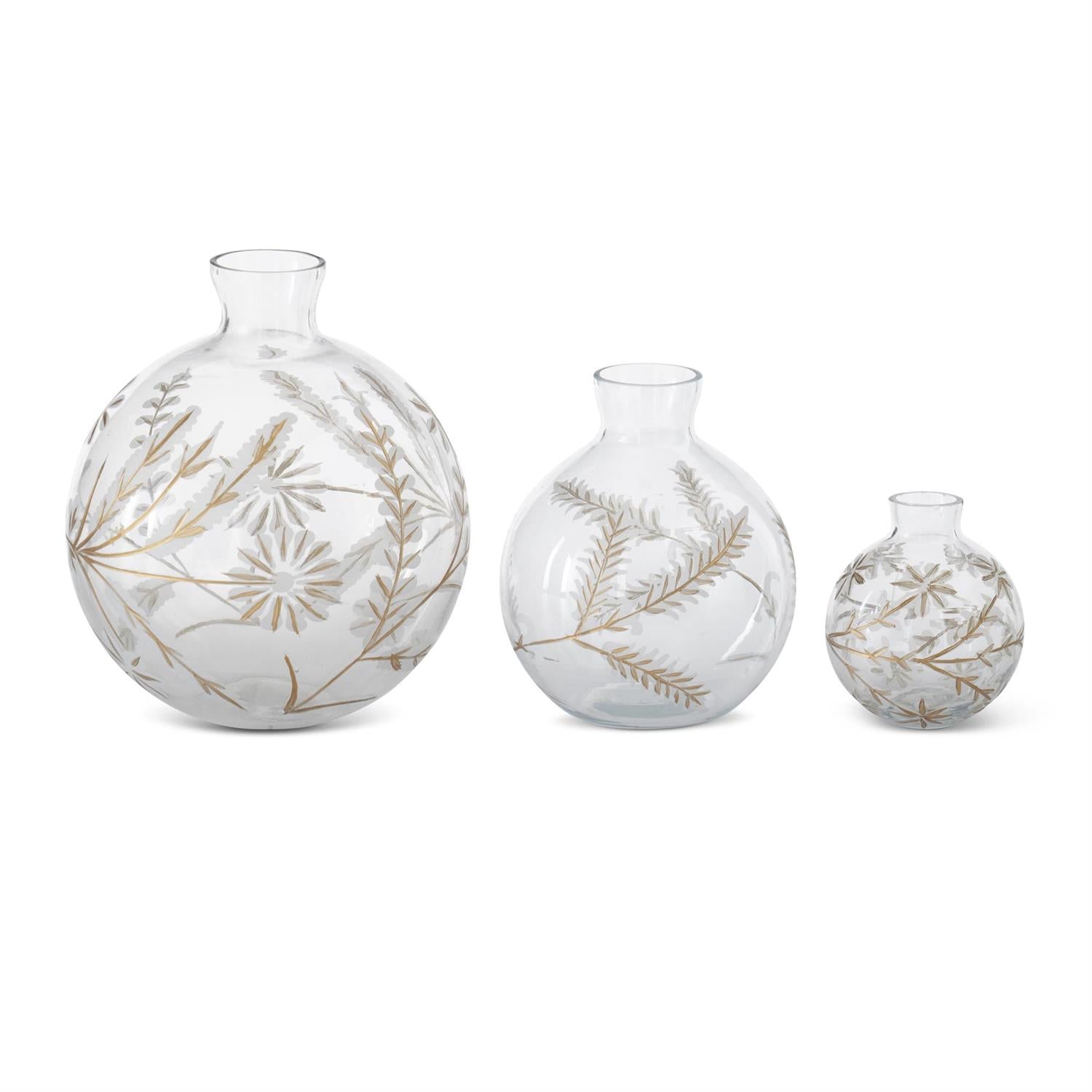 Round Etched White & Gold Painted Floral Glass Vases (3 Sizes)