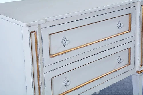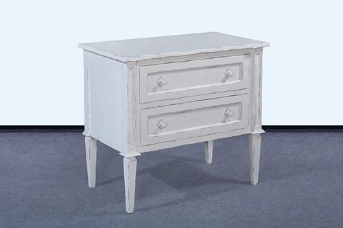 Two Drawers, Tapered Legs, Simple Design With Old World Distressing, and Solid Wood Construction in an Antique White Finish or Antique White with Gold Accents.