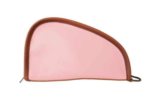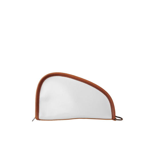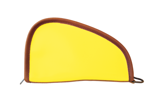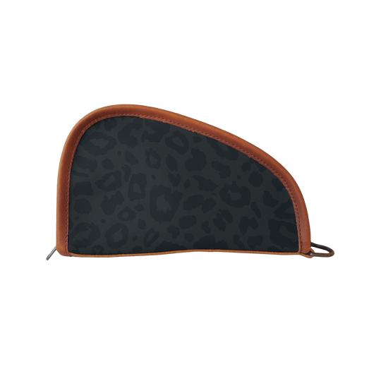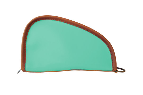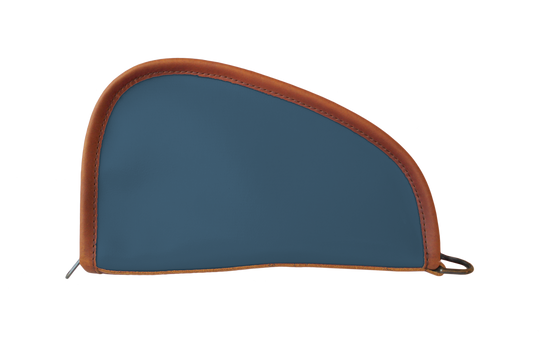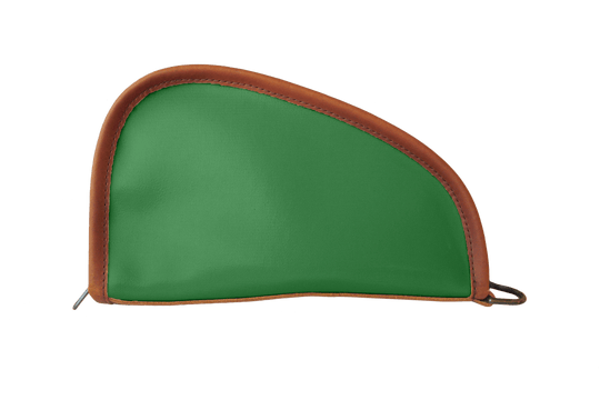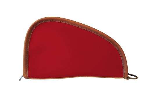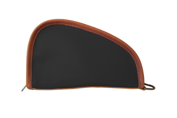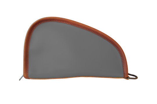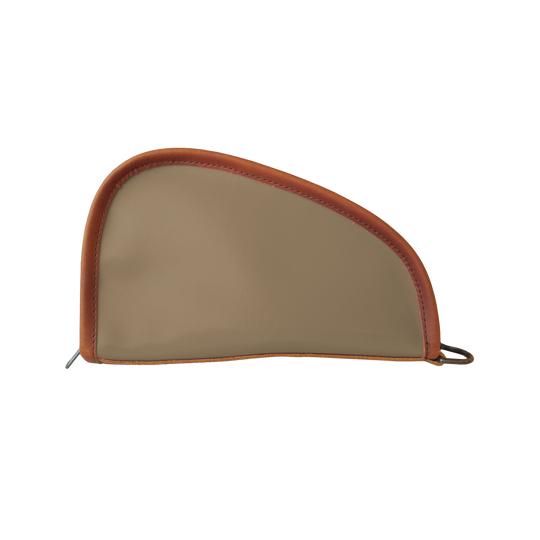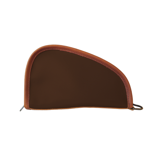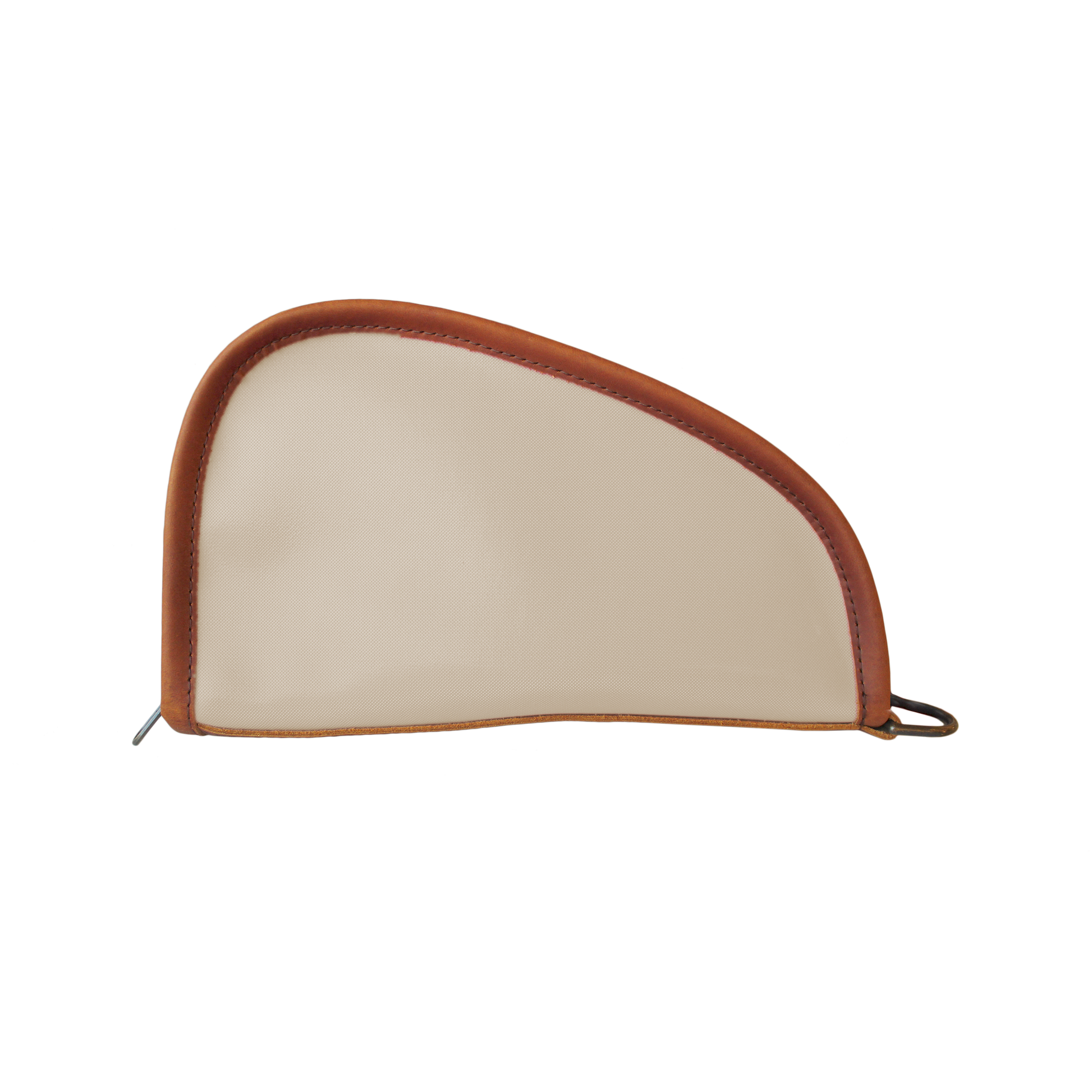 Coated canvas with Oiled Leather trim. Fully lined in fleece for protection. Zippered closure with antique brass hardware. Accommodates most small pistols and revolvers. Antique Brass D-Ring to hang for easy storage.