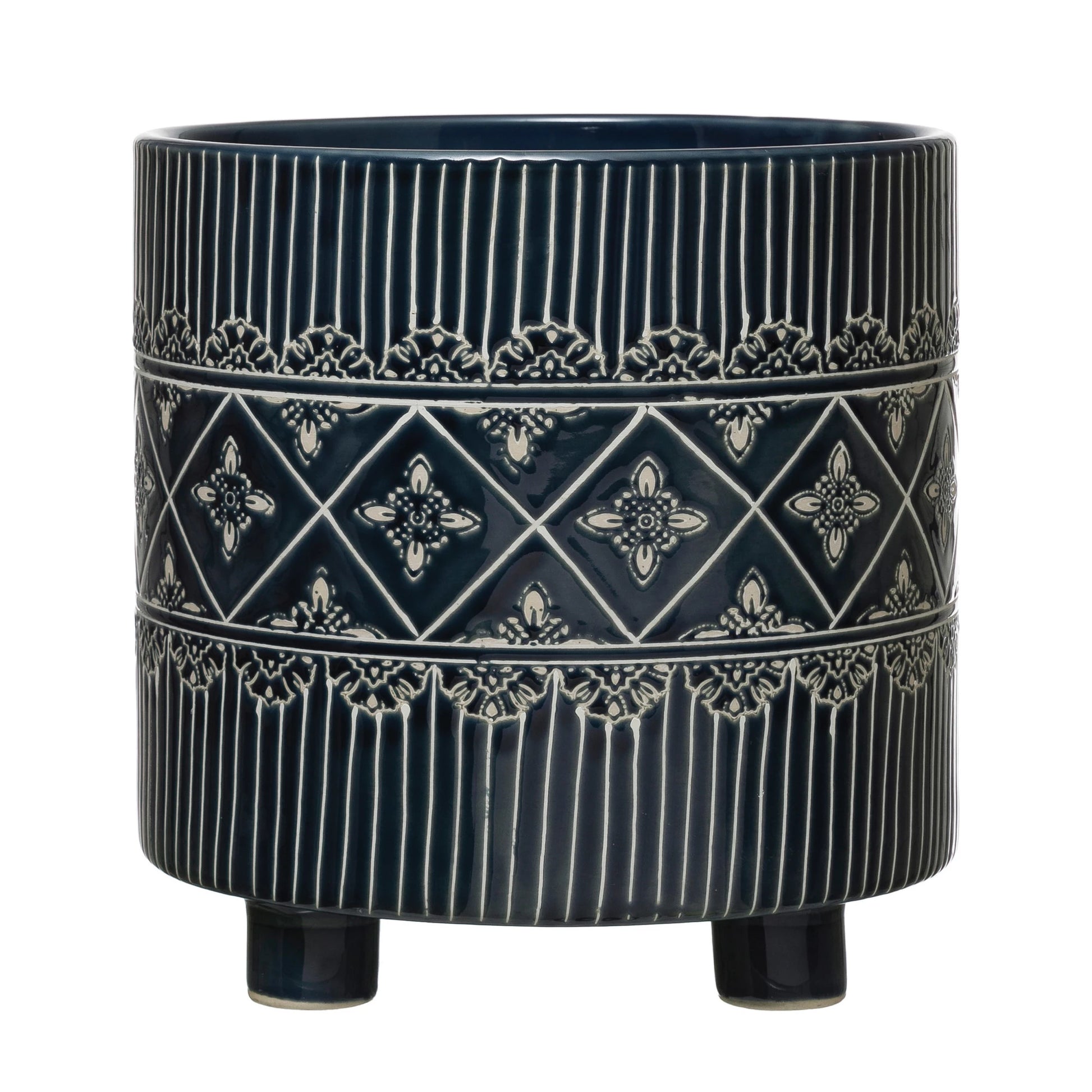 This gorgeous debossed stoneware footed planter has an ornate pattern of stripes and shapes. An elegant and stylish planter helps add a lively touch of greenery to any bedroom, kitchen, living room, or office.
