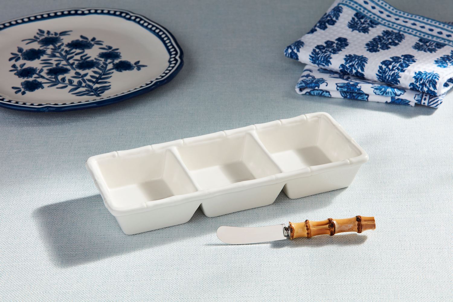 2-piece set. Stoneware triple tidbit dish with bamboo textured detail. Comes with stainless steel spreader with bamboo wood handle.